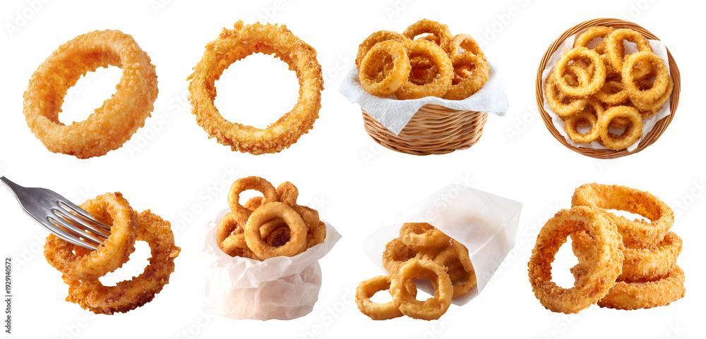 Set of golden fried crispy onion rings calamari squid, battered breaded crunchy, on fork, rattan basket with napkin, takeout paper bag, stack pile, transparent cutout PNG. Many different mockup #1929140572