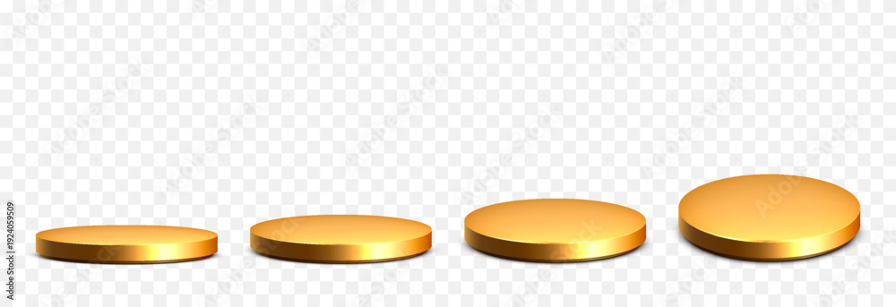 Set of golden round podiums PNG. Golden podium or pedestal from different angles. Podium for product or goods advertising. #1924059509