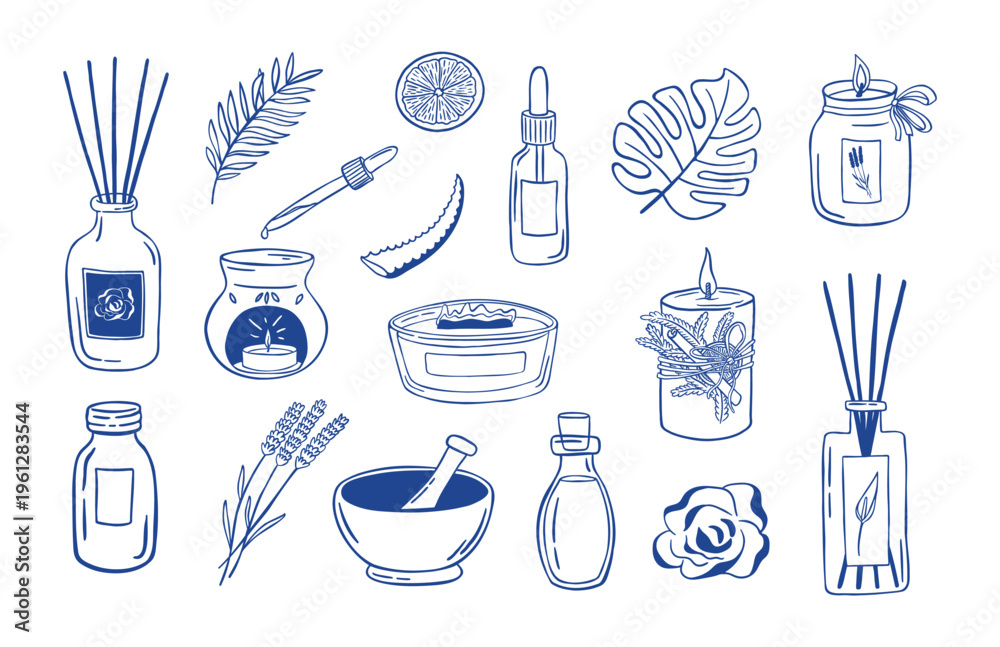 Set of hand drawn aromatherapy and spa icons. Doodle wellness and self-care elements with diffuser, essential oil, candle, mortar and herbs vector illustration #1961283544