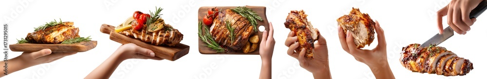 Set of hand holding grilled roasted turkey chicken thigh breast meat, wooden serving board, knife slice torn, isolated transparent cutout PNG. Many different style. Mockup for design #1731295015