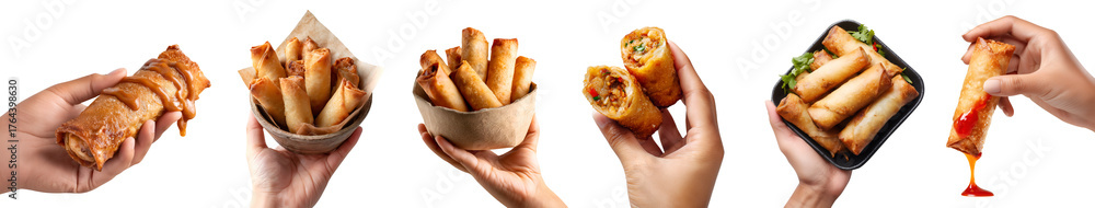 Set of hand holding spring egg rolls, crispy fried pastry snack with vegetable meat filling, sauce drip, craft bowl dish, stack pile bitten broken, transparent cutout PNG. Many different Mockup #1764398630