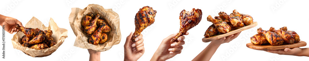 Set of hand holding turkey chicken drumstick thigh, grilled roast pile stack, wooden serve board, takeaway paper bowl, isolated transparent cutout PNG. Many different style. Mockup for design #1750035984