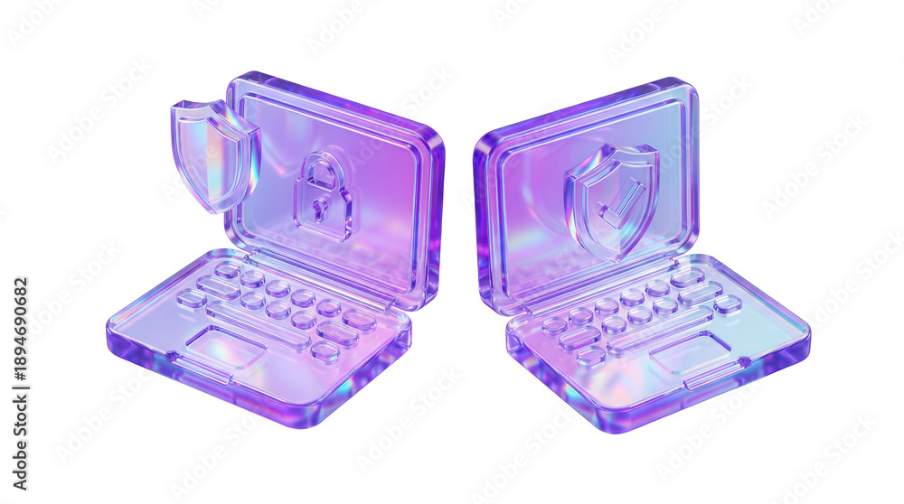Set of laptop computer variations in holographic glass style with security shield and padlock symbols #1894690682