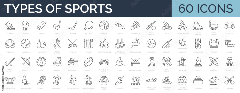 Set of 60 line icons related to types of sports. Collection of 60 kinds of sports and activities. Editables stroke. Vector illustration #588209850