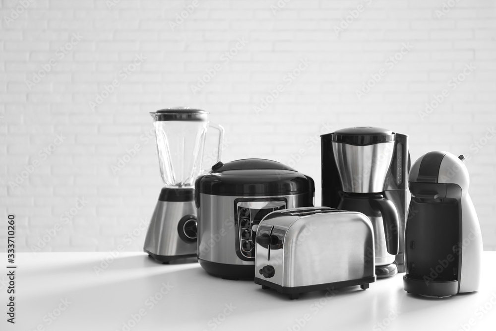 Set of modern home appliances on white table #333710260