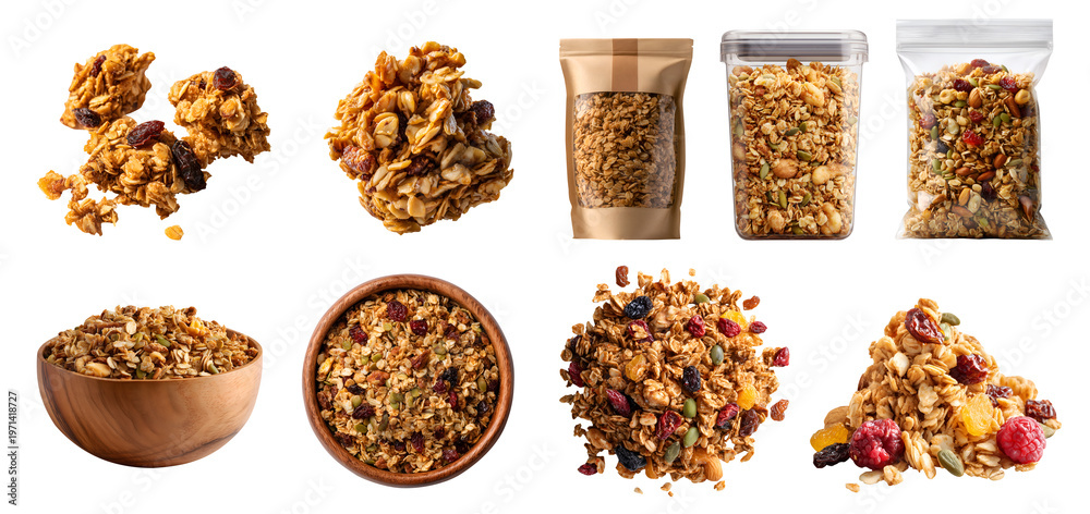 Set of muesli Granola, rolled oats, nuts seeds sweetener of breakfast snack cereal mix, takeout plastic paper bag, wooden bowl, stack pile cluster, transparent cutout PNG. Many different mockup #1971418727