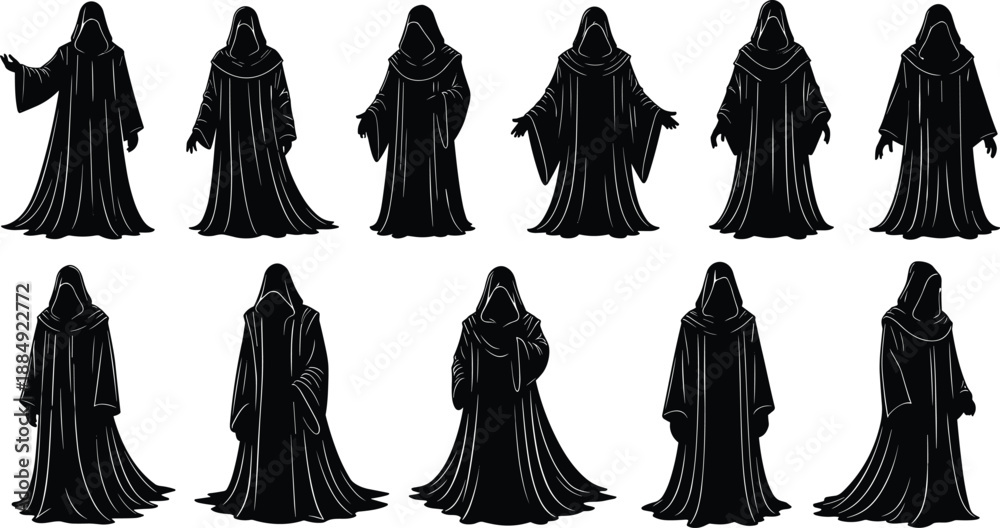 Set of mysterious hooded figure silhouettes wearing long robes and cloaks, collection of dark wizard, monk or priest characters in various poses, #1884922772