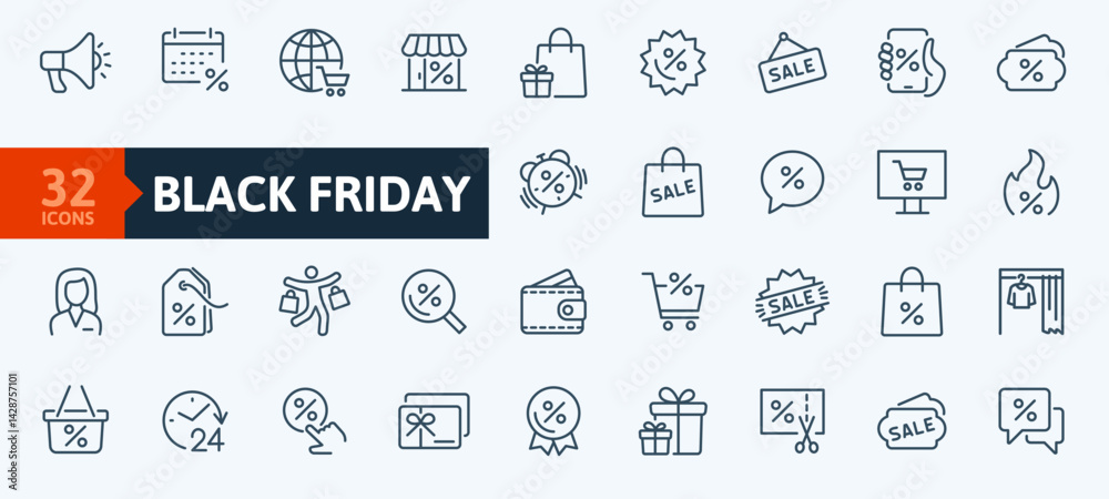 Set of 32 outline icons related to shopping. Linear icon collection. Black Friday, Sale Day. Big discount and gift for customers. #1428757101