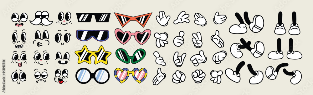Set of 70s groovy comic vector. Collection of cartoon character faces in different emotions, hand, glove, glasses, shoes. Cute retro groovy hippie illustration for decorative, sticker. #643935986