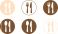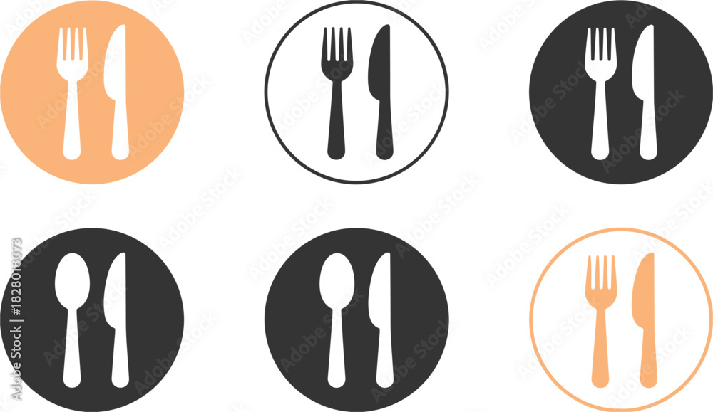 Set of six icons depicting cutlery and plates Keywords: cutlery, fork, knife, spoon, plate, dish #1828018073