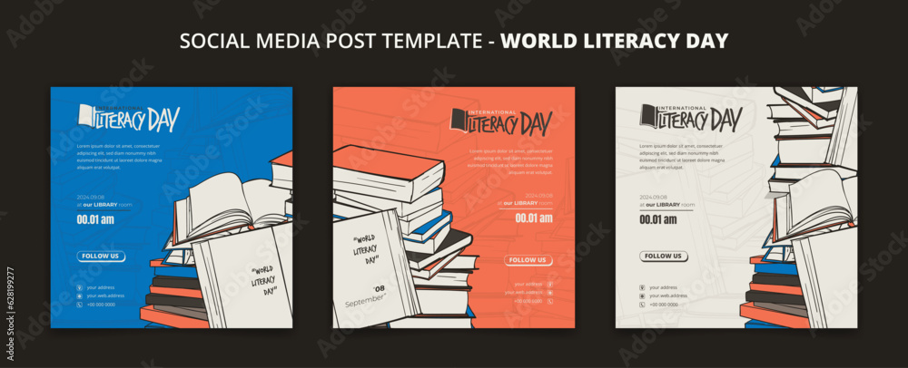 Set of social media post template with doodle art background for international literacy day campaign #628199277