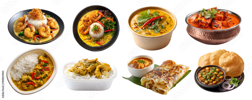 Set of spicy stew curry sauce gravy, meat fish seafood vegetable, takeout carton box, banana leaf, bowl plate with roti canai prata naan Papad, transparent cutout PNG. Mockup for design #1968034963