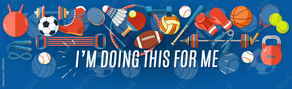 Set of sport balls and gaming items at a blue background. Healthy lifestyle tools, elements. Vector Illustration. #181940119