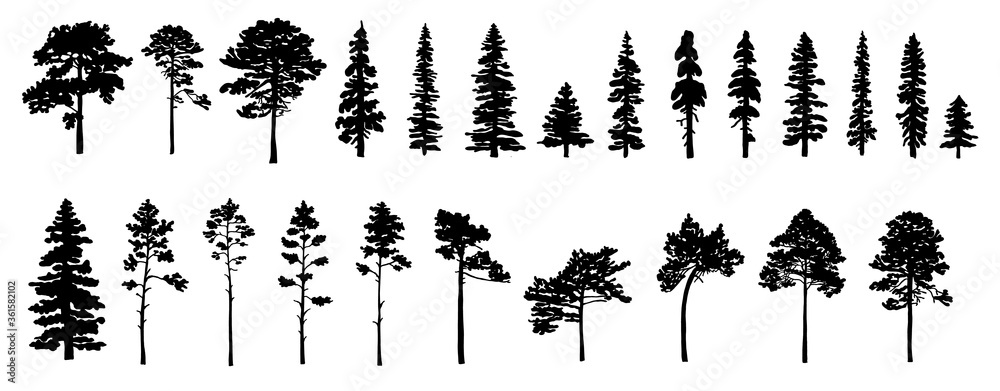 Set of tree silhouettes of different types and shapes isolated on white background. Illustration. #361582102