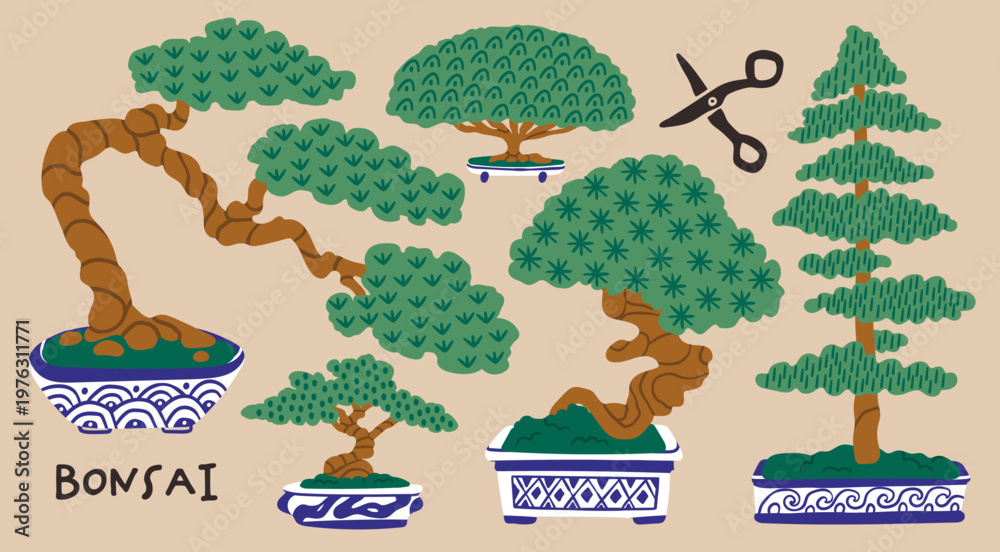 Set of various Bonsai trees. Various small decorative trees in pots. Traditional Japanese plants, oriental garden art. Little potted decorative houseplants. Hand drawn trendy Vector illustration #1976311771