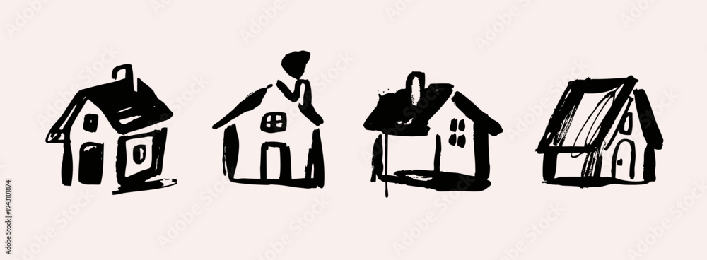 Set of various small tiny Houses. Paint brush cartoon minimal style. Flat design. Hand drawn Vector illustration. Isolated black and white design elements. Building, sweet home, real estate concept #1943101874