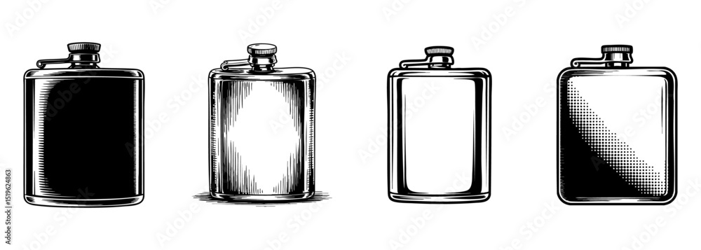 set of vintage metal hip flask and drink container vector illustrations, personal beverage portability #1519624863