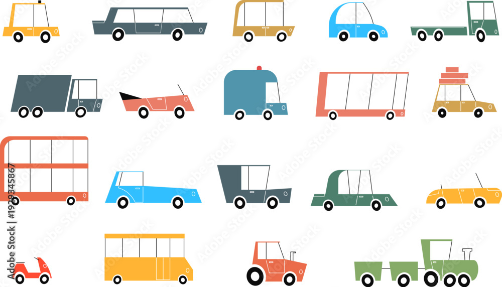 Set vector illustration of cars and land transport in cartoon mid century modern style. Collection elements for children book, game, print. #1929345867