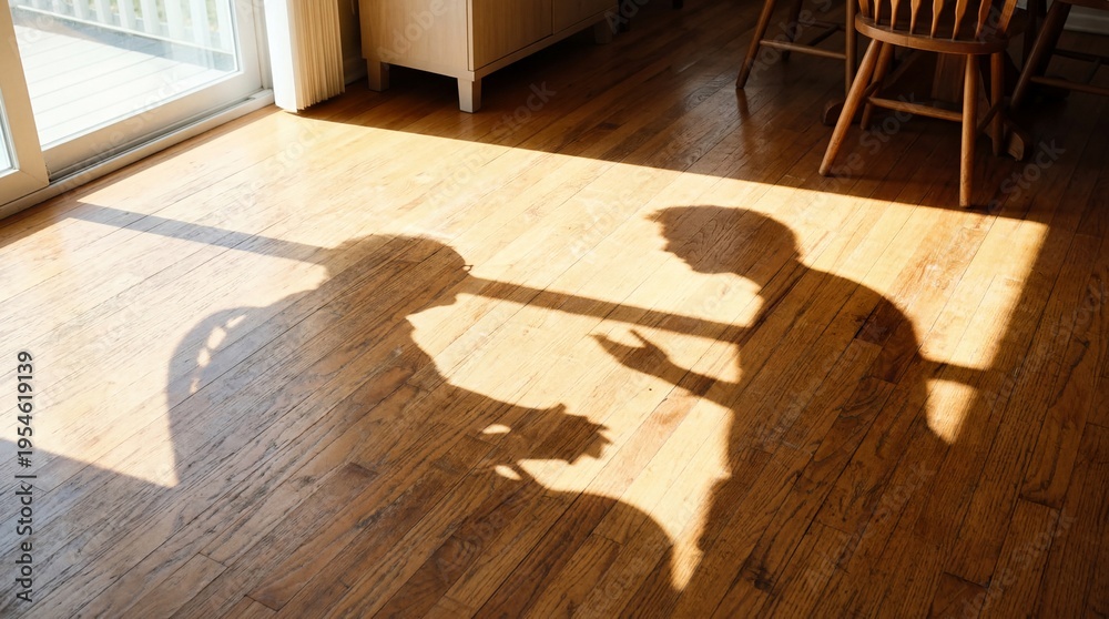 Shadows of two people holding hands on a sunlit wooden floor near a window, abstract silhouette for family connection, togetherness and home interior light #1954619139