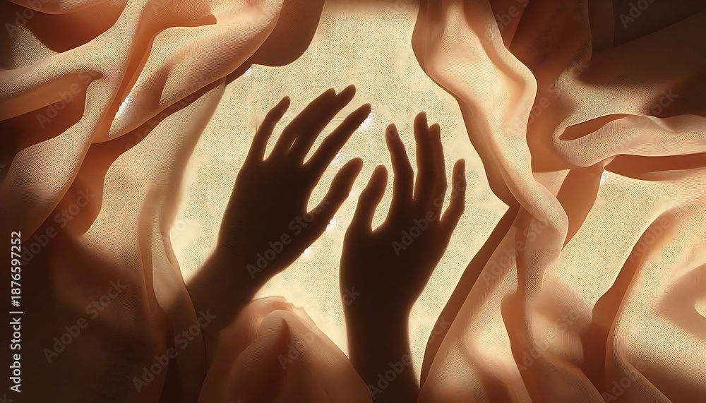 Shadowy hands reaching through soft, flowing peach fabric with ethereal backlighting and delicate textures. #1876597252