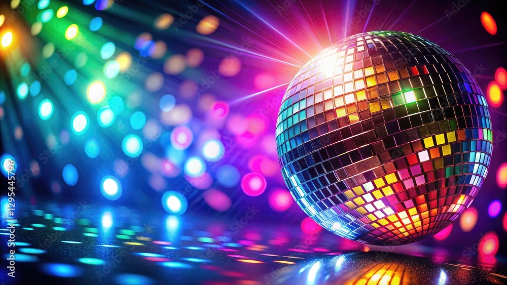 Shimmering disco ball illuminates a retro 70s/80s dance floor, festive lights painting a vibrant nightclub celebration. #1295445796
