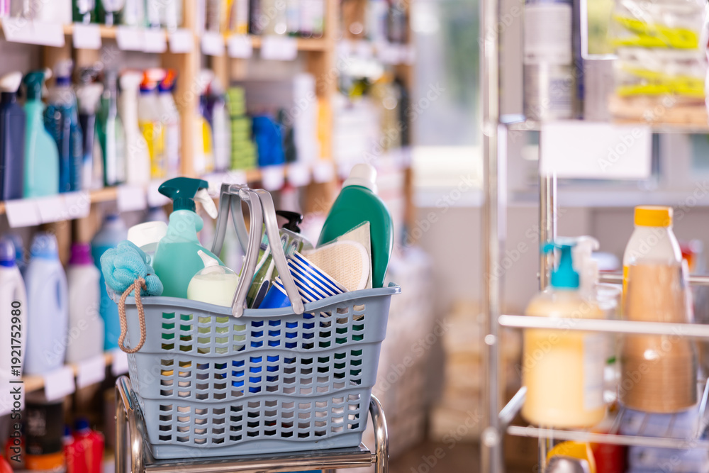 Shopping basket full of essential cleaning products, detergents, sprays, scrubbing tools and personal care products, ideal for home maintenance and hygiene displayed in store for purchase.. #1921752980