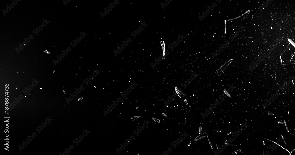 Side angle photo of flying shattered glass shards and dust isolated on black background. High detail debris explosion, perfect for VFX overlay, compositing, transitions or dramatic design elements. #1878874735