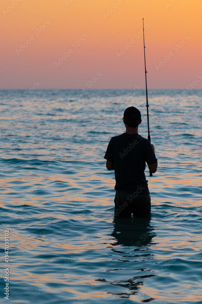 Silhouette of a fisherman standing in the sea and fishing during a warm sunset. Calm ocean waves and orange sky create a peaceful coastal scene with relaxing evening atmosphere by the water #1947039102