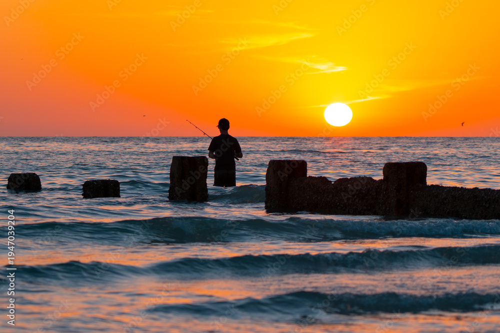 Silhouette of a fisherman standing in the sea and fishing during a warm sunset. Calm ocean waves and orange sky create a peaceful coastal scene with relaxing evening atmosphere by the water #1947039204