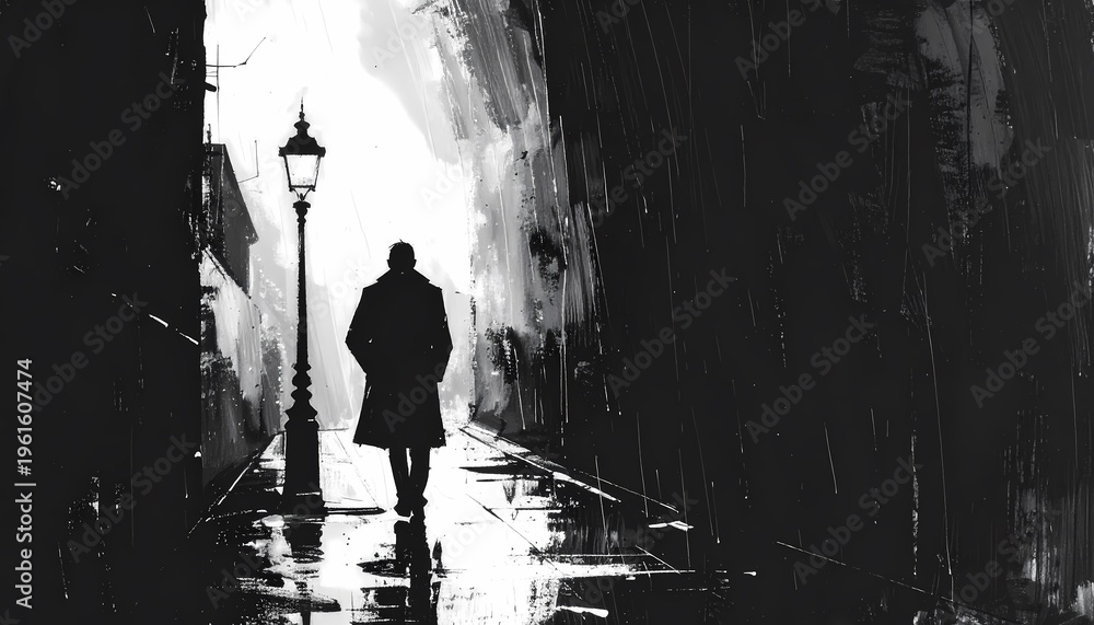 Silhouette of a Lone Man Walking Down a Dark Rainy Alleyway #1961607474