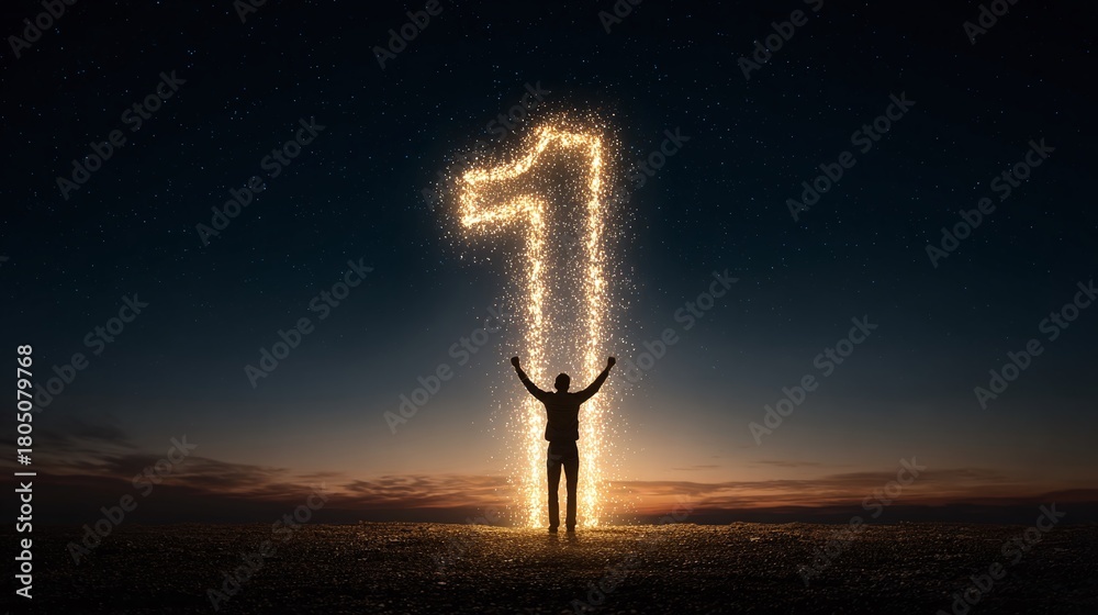 Silhouette of a person standing beneath a glowing number one in the sky, symbolizing achievement and success under a starry night. A powerful image of ambition fulfilled. #1805079768