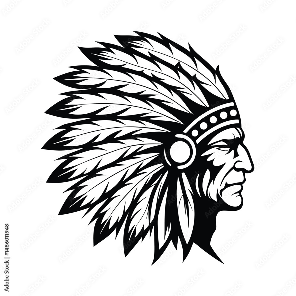 Silhouette of Native American Chief in Headdress, Tribal Chieftain Profile Black & White #1486011948