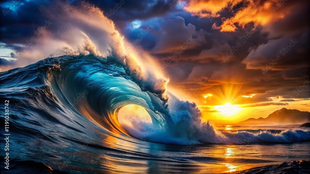 Silhouette of Ocean Waves with Magical Light, Abstract Coastal Art #1191038742