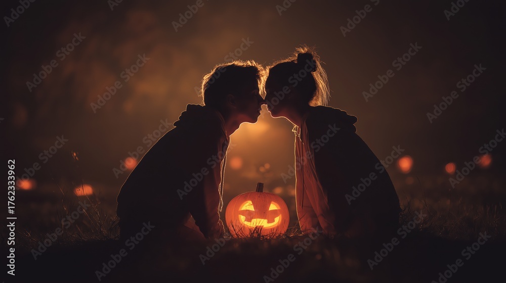 silhouette shadow of young love couple lean for kissing at Halloween night #1762333962