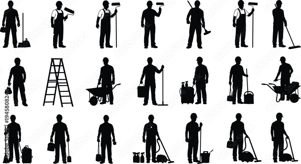 Silhouette workers with construction tools, cleaning equipment, teamwork labor force, industrial maintenance #1945808244