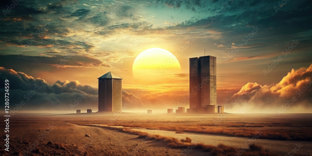 Silhouetted minimalist architecture against a surreal, vibrant sunset; a sci-fi dreamscape. #1280724559