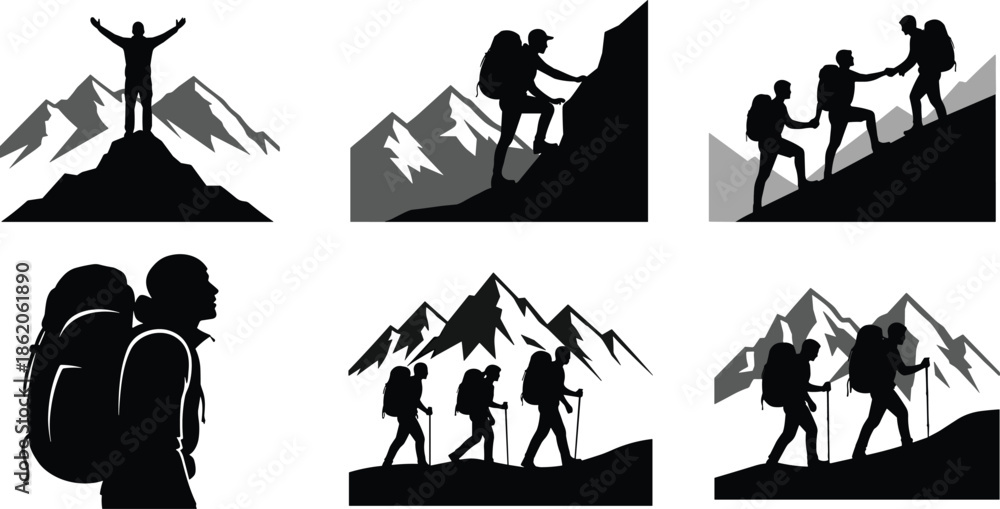 Silhouettes of hikers and climbers in mountainous landscapes mountains adventure #1862061890