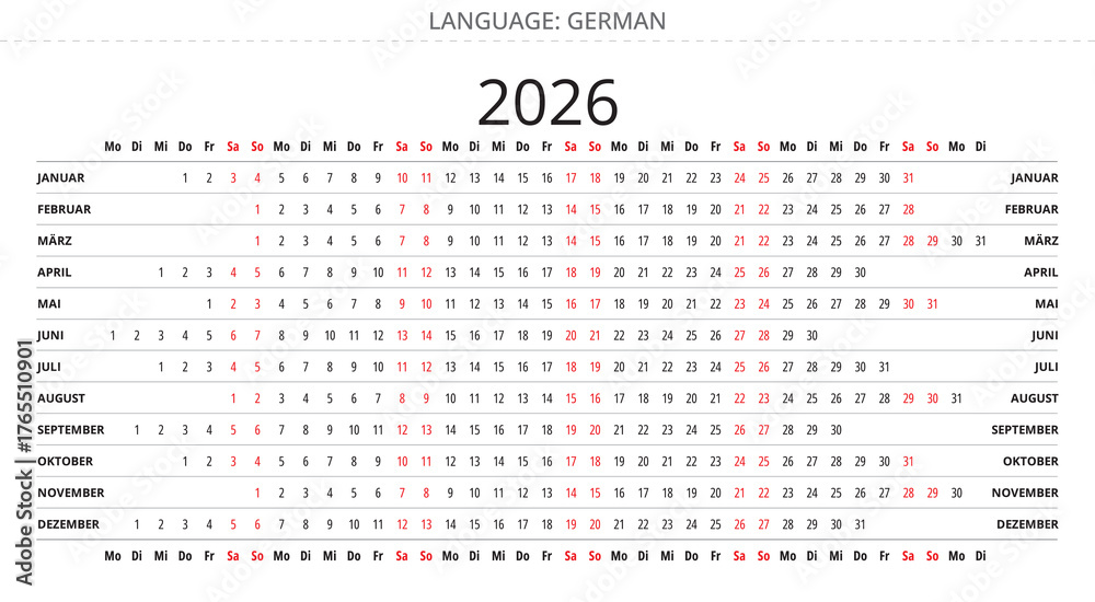 Simple 2026 german linear annual calendar Germany. deutsch kalender #1765510901