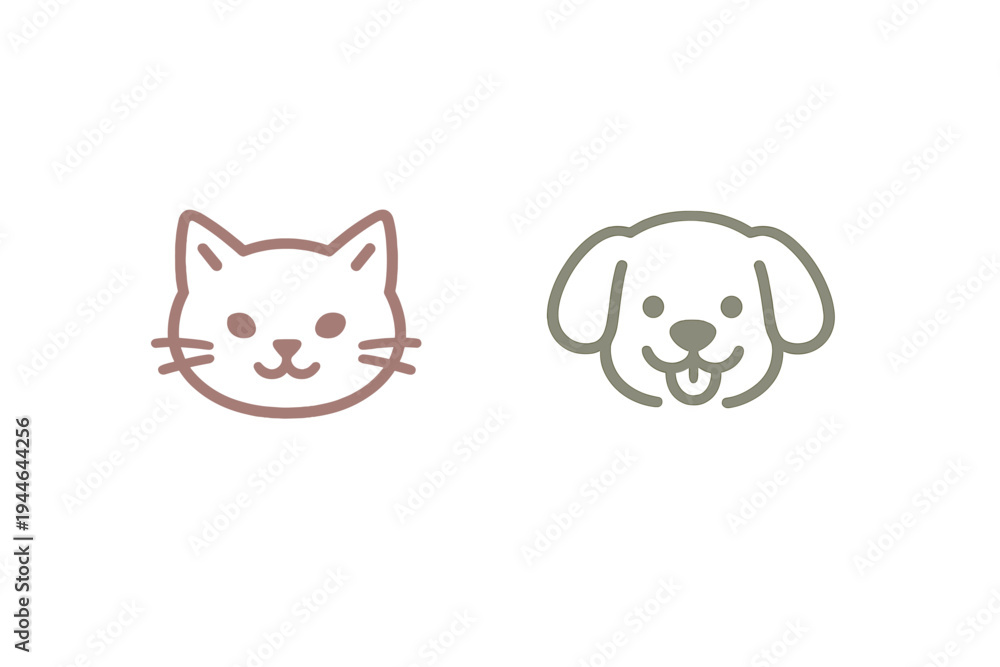 Simple line art illustrations of a cat and a dog face side by side on a dark background. The icons feature minimalist outlines in muted pink and green tones for pet themes. #1944644256