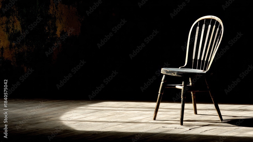 Single tilted chair in an empty room with dramatic side lighting and deep shadows. travel magazines, destination branding, designed for outdoor magazines and nature guides. #1840575042
