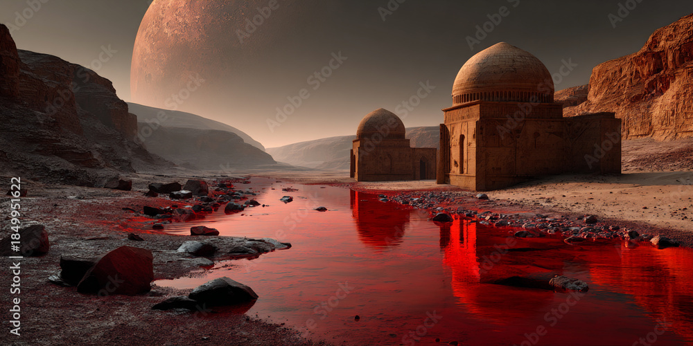 sinister river on a desert planet, ancient alien ruins by an ominous river, otherworldly desert river and lost civilization #1849951622