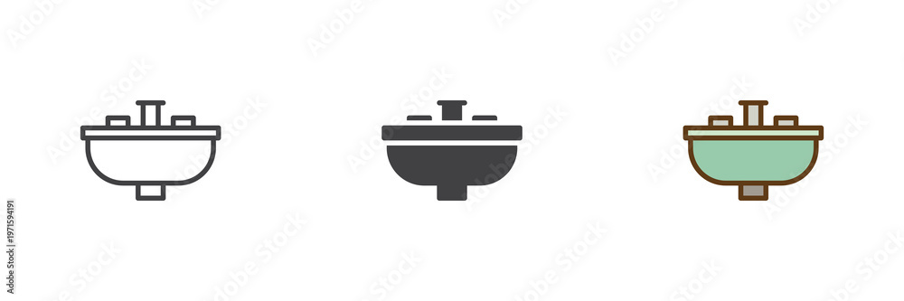 Sink with faucet icon set in line, outline and solid styles. Sink icon with editable stroke vector sign, water symbol, kitchen or bathroom fixture icon. #1971594191