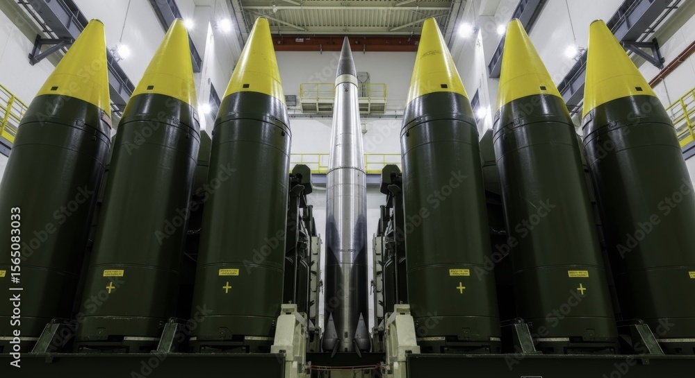Six massive intercontinental ballistic missiles standing in a secure industrial facility #1565083033