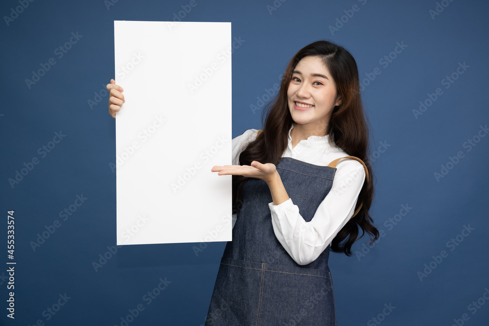 Small business owner sme Asian woman showing and holding blank white billboard isolated on deep blue background #455333574