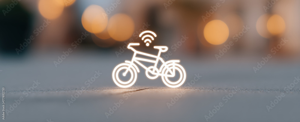 Smart city concept with glowing bicycle icon and Wi-Fi signal. Symbol of electric bike sharing, urban mobility and connected transport app #1778012750