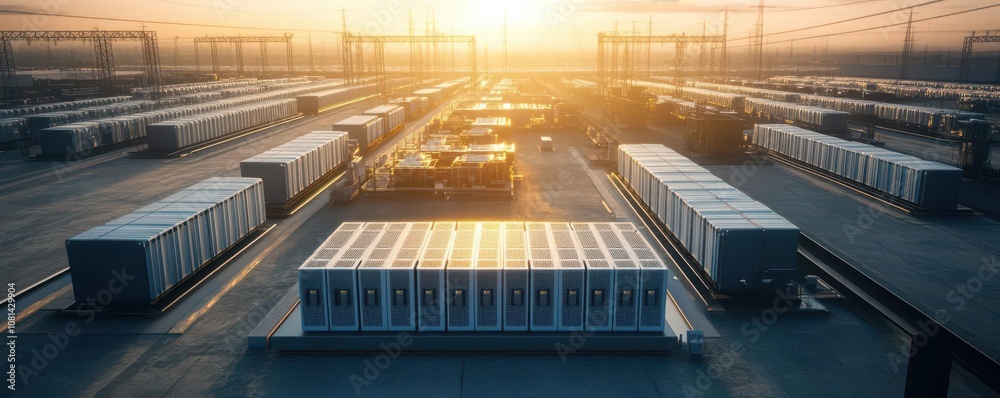 Smart Grids and Sustainable Energy Storage, A massive energy storage installation featuring rows of high-capacity batteries, stabilizing the smart grid for renewable energy sources #1081429904