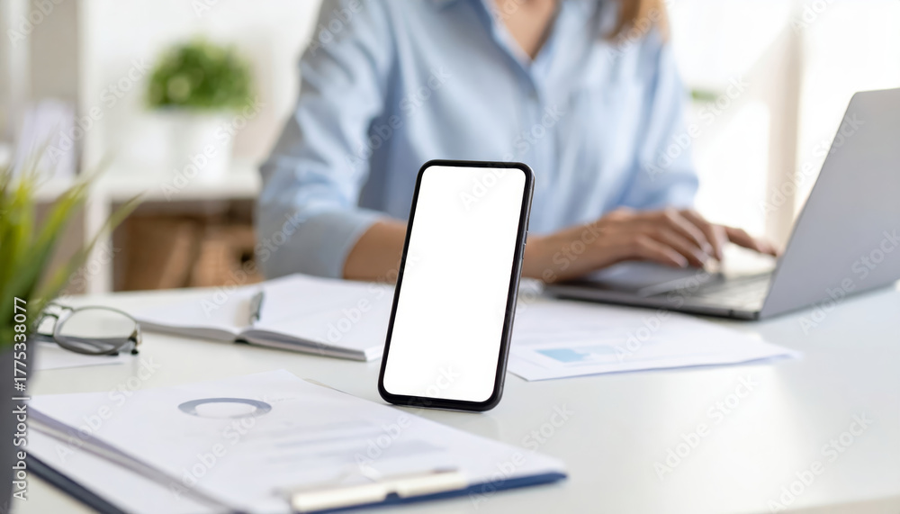 Smartphone blank screen office desk laptop documents business workspace woman typing modern #1775338077