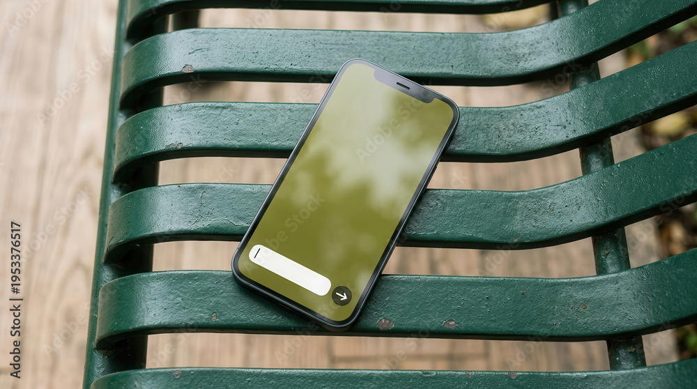 Smartphone mock up on green metal bench with wooden floor background, featuring blank screen for design and text overlay opportunities in outdoor setting #1953376517