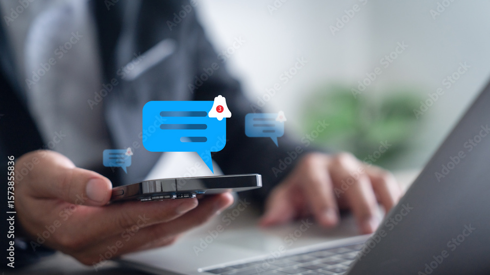 Smartphone user with notification bell icon on virtual screen. Notification concept. Push notifications. Web notifications. Schedule and announcements. #1573855836
