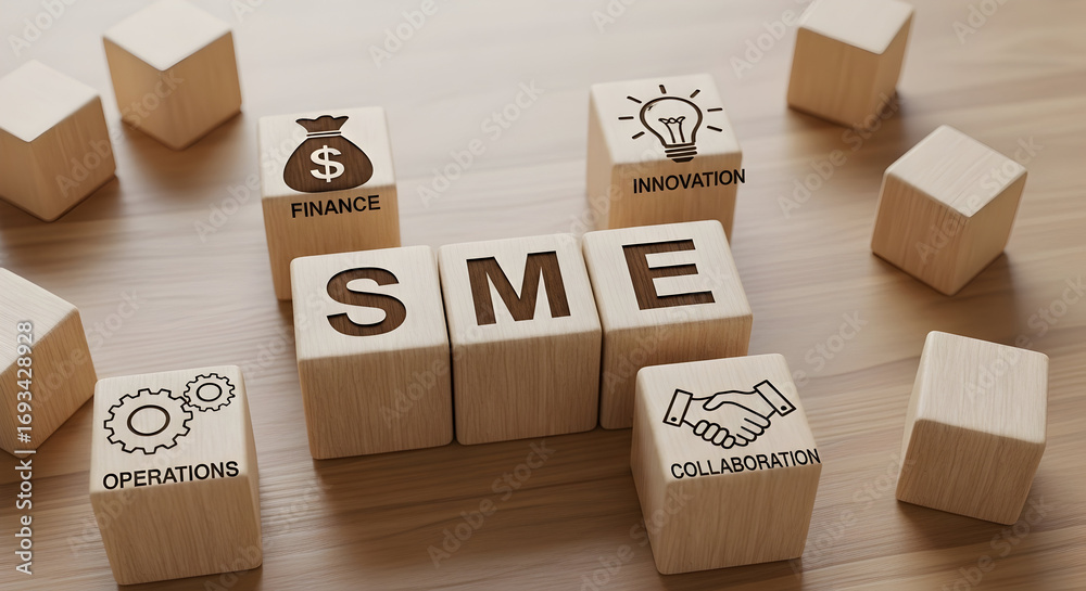 SME business concept with wooden blocks showing finance, innovation, and collaboration #1693428928